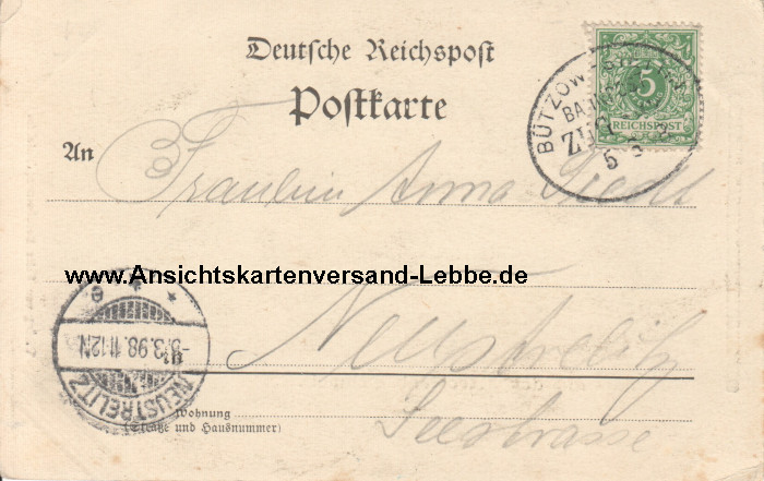 Gelaufen 1898 als Bahnpost nach Neustrelitz, Seestrasse, Fräulein Anna Tiedt