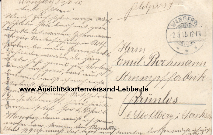 * gelaufen 1915 nach Brünlos b. Stollberg i. Sachsen, Herrn Emil Bochmann Strumpffabrik * 'Liebe Eltern!' *