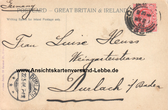 Gelaufen 1904 nach Durlach in Baden, Weingartenstrasse, Frau Luise Heuss