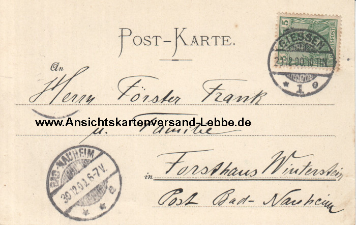 * Gelaufen 1900 nach Forsthaus Winterstein Post Bad Nauheim, Herrn Förster Frank u. Familie *