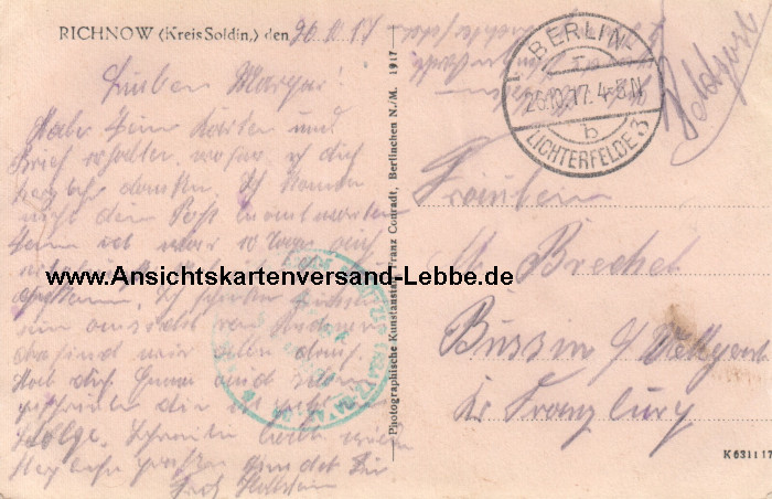 Richnow (Kreis Soldin) Neumark - Herrschaftliches Wohnhaus - Pfarrhaus - Haus Fiebelkorn - Gasthaus von Ferdinand Hollstein - Ostbrandenburg - Feldpost 1917 nach Bussin bei Velgast Kreis Franzburg-Richtenberg M. Brechel - heute Rychnow - Barlinek