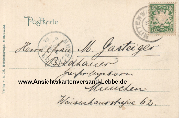 VERLAG/PUBLISHER/EDITEUR: A. Irl, Hofphotograph, Mittenwald.