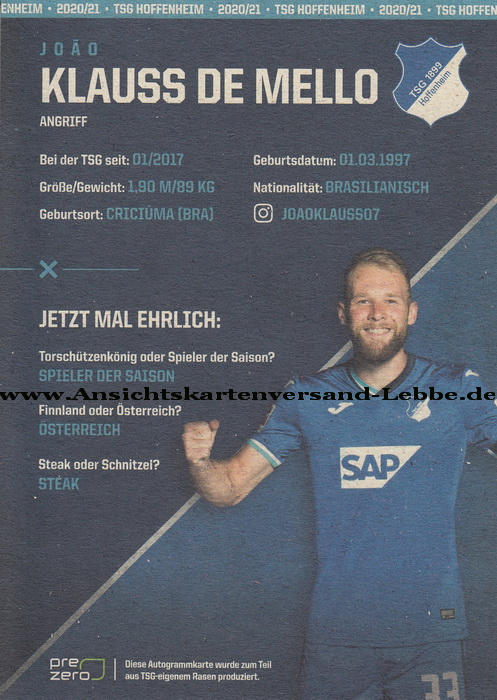 Klauss * 1.3.1997 Criciuma (Joao Klauss de Mello) 2020/2021 TSG 1899 Hoffenheim