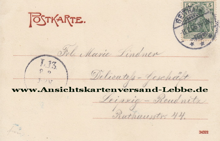 * gelaufen 1906 nach Leipzig Reudnitz, Rathausstr. 44, Frl. Marie Lindner, Delicateß-Geschaeft *