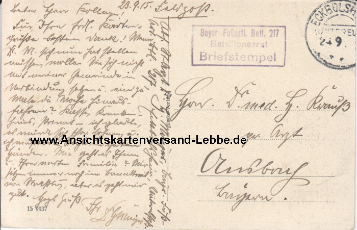 Absender: Kollege Stabsarzt Dr. H. Mayer, Bayer. Fußart. Btl. 217, Eckbolsheim, Unterelsass (?)