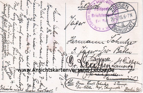 Gelaufen als Feldpost 1915 an Jäger Hermann Schulze